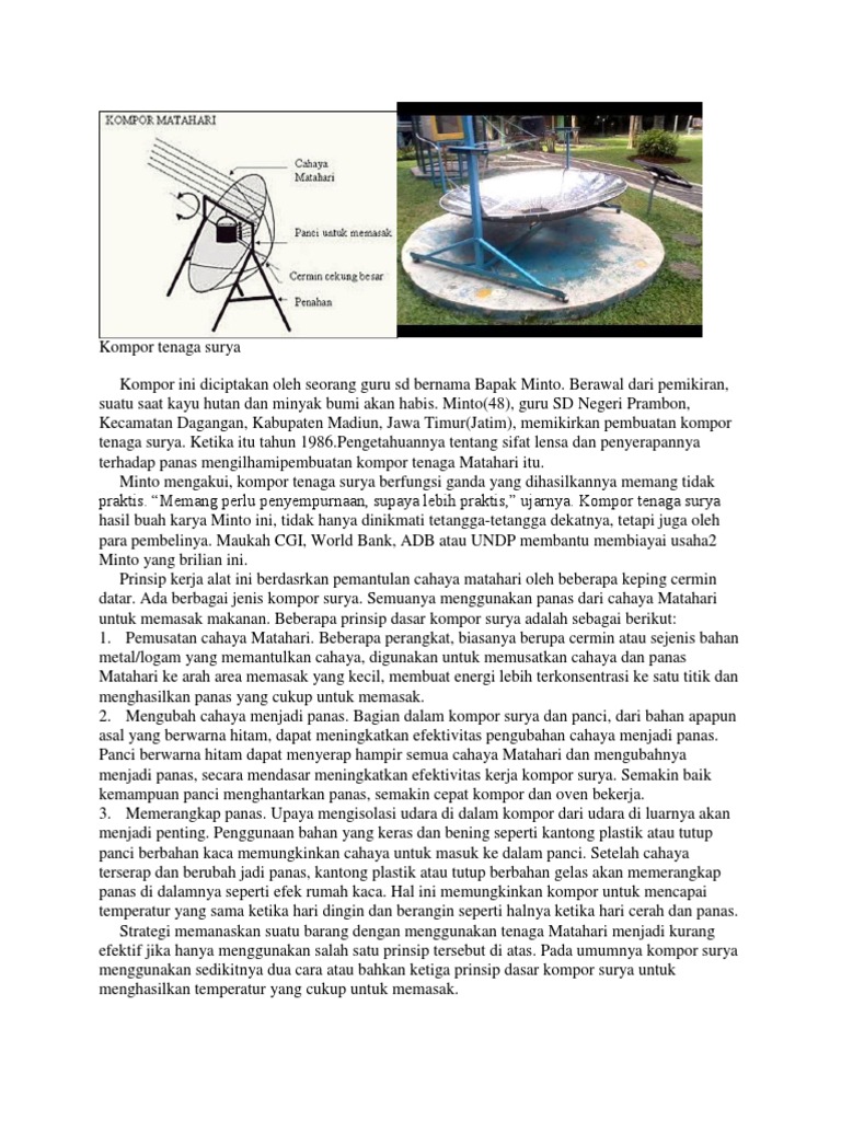 Kompor ini bagus buat kami, karena dengan kompor ini, kami memasak dan mendidihkan air tanpa butuh kayu, gas atau minyak. Ujilah kompor tenaga surya buatan kalian. Meskipun tidak bisa menggantikan sepenuhnya energi minyak dan gas bumi, setidaknya bisa menghemat dan mengurangi konsumsi minyak atau gas. Sel tersebut berperan untuk menangkap panas matahari yang nantinya akan diubah menjadi sebuah energi listrik. Kompor tenaga surya (solar cooker) adalah sebuah peralatan yang menggunakan energi panas matahari untuk memasak.